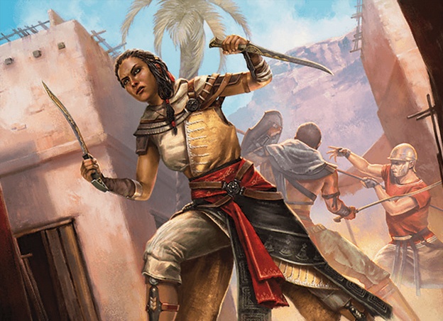 Whenever a historic creature you control deals combat damage to a player, create a 1/1 black Assassin creature token with menace. (Artifacts, legendaries, and Sagas are historic.)