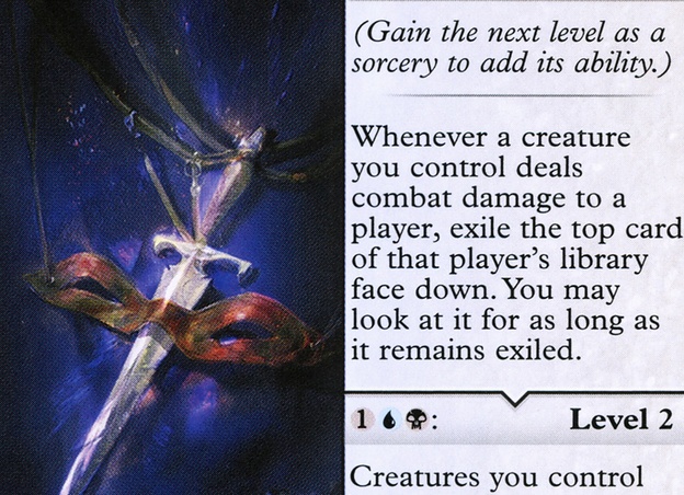 Each Class has five abilities. The three in the major sections of its text box are class abilities. Class abilities can be static, activated, or triggered abilities. The other two are level abilities, one activated ability to advance the Class to level 2 and another to advance the Class to level 3.