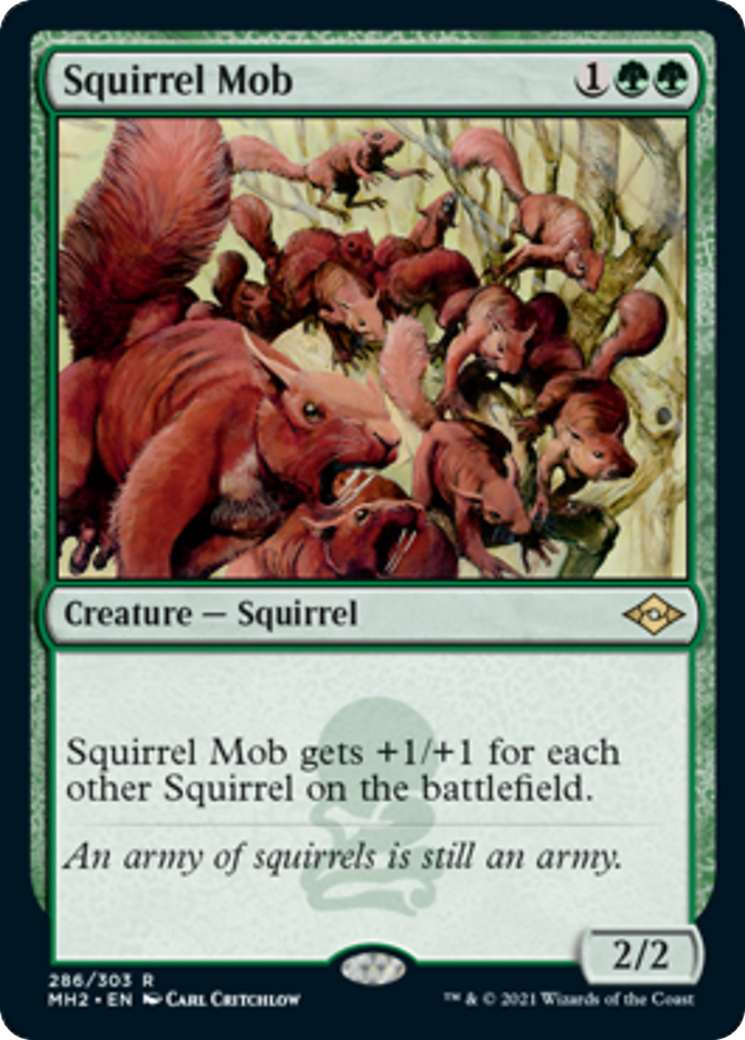 Because damage remains marked on a creature until the cleanup step or an effect removes that damage, nonlethal damage dealt to Squirrel Mob may become lethal if the number of other Squirrels on the battlefield decreases.