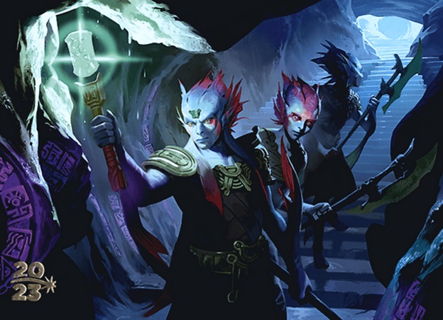 Whenever one or more nontoken Merfolk you control become tapped, create a 1/1 blue Merfolk creature token with hexproof.