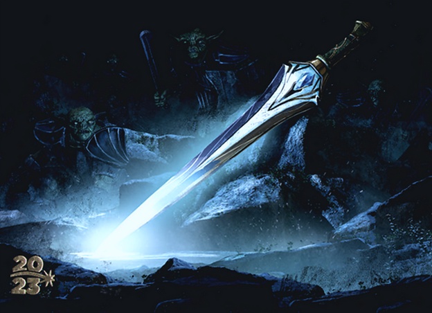 Equipped creature has first strike as long as it's blocking or blocked by a Goblin or Orc.