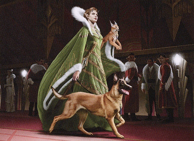 If you would create one or more tokens, you may instead create that many 2/2 green Cat creature tokens with haste or that many 3/1 green Dog creature tokens with vigilance.